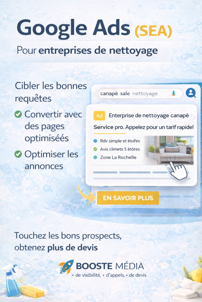 Chez Booste Média, nous proposons des services marketing digital pour entreprise de nettoyage qui augmentent votre visibilité locale et vos demandes — que vous soyez auto-entrepreneur ou société bien établie.